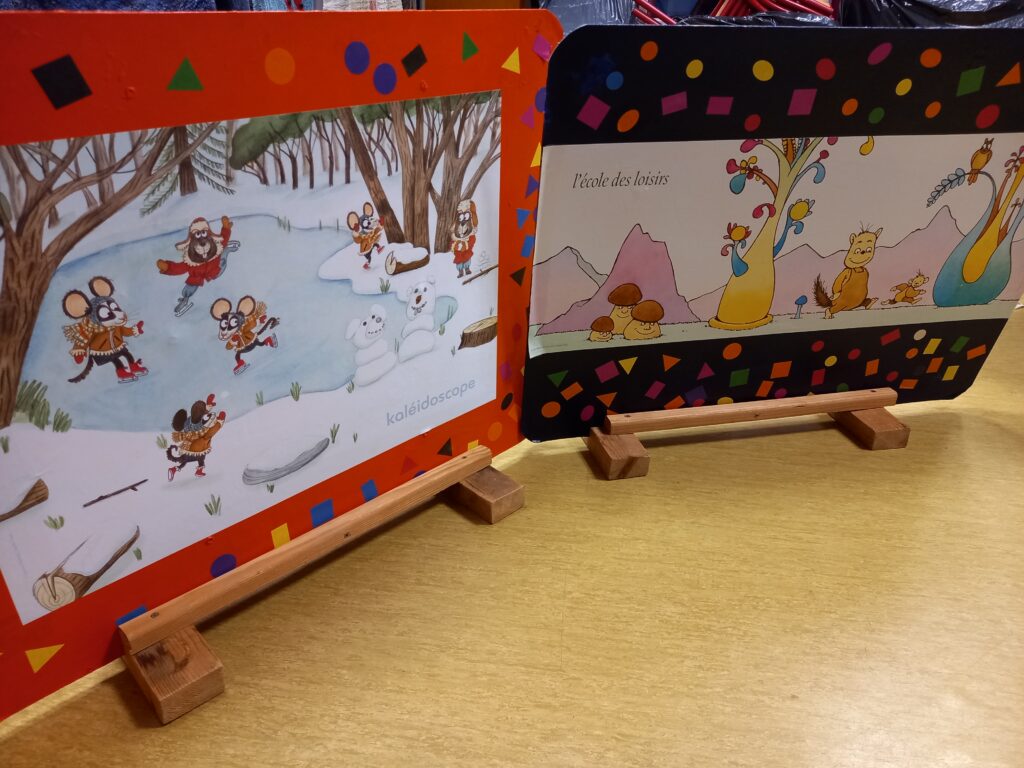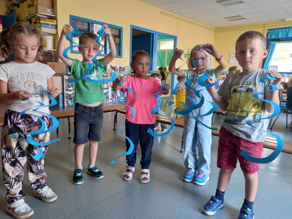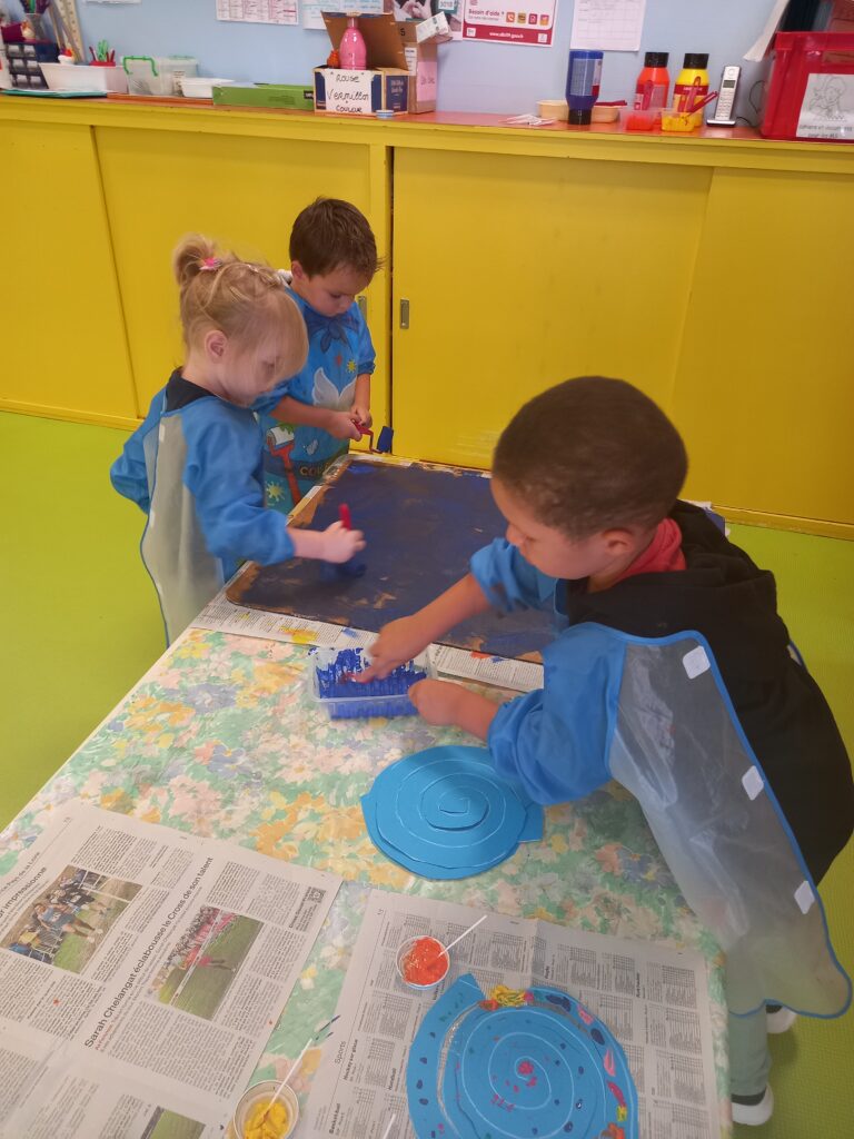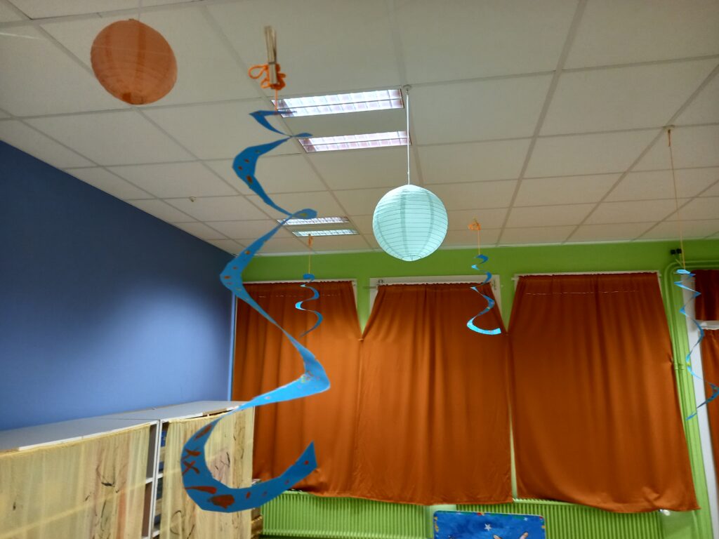En ce début d’année, ils ont décoré la salle de sieste avec l’aide des MS MS ..Au programme des mobiles à suspendre et des petites cloisons …