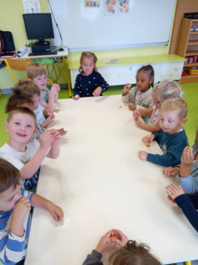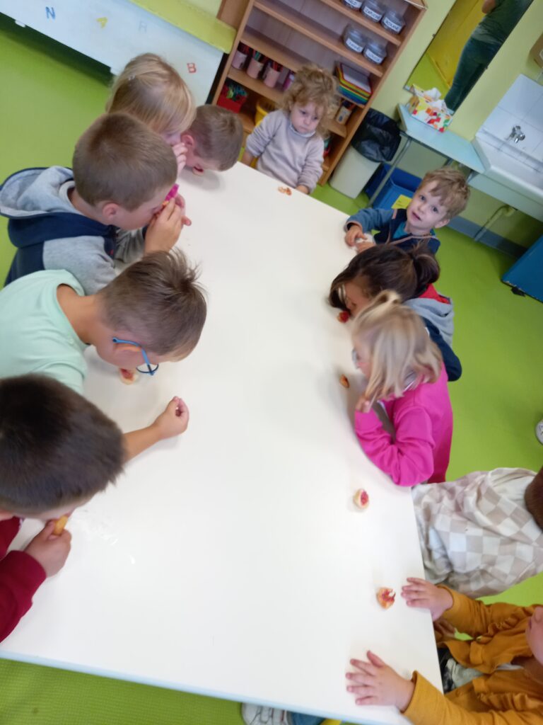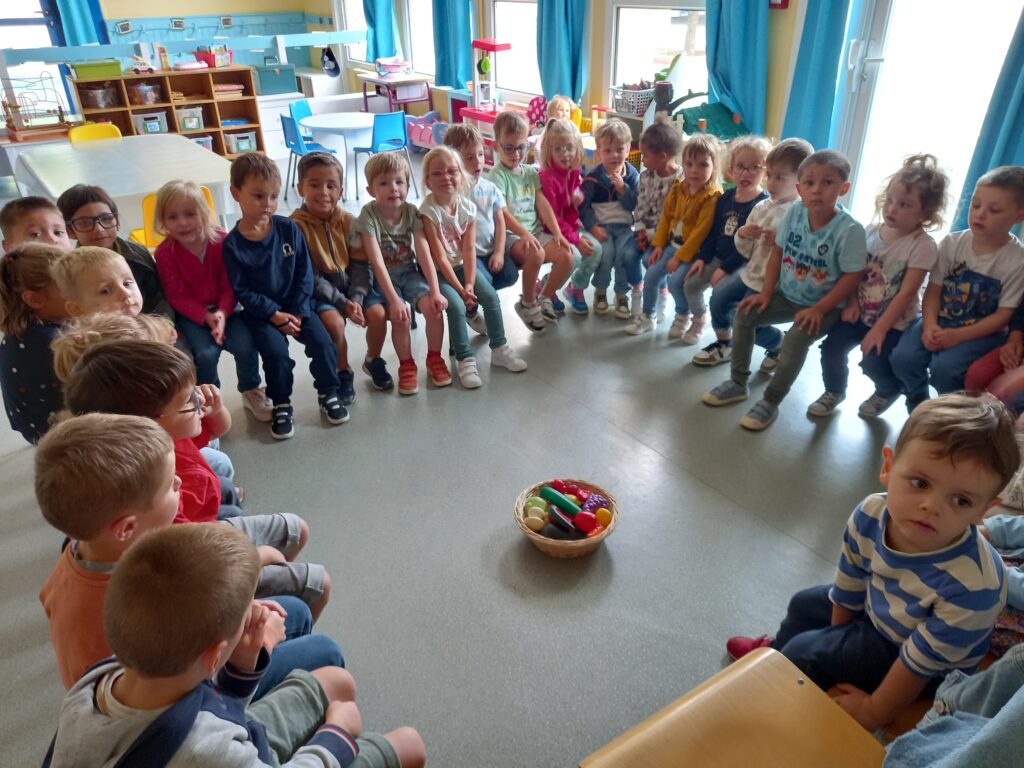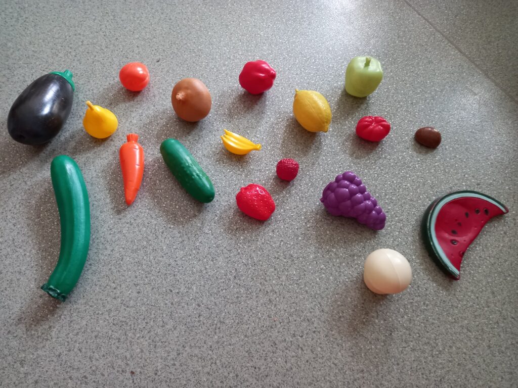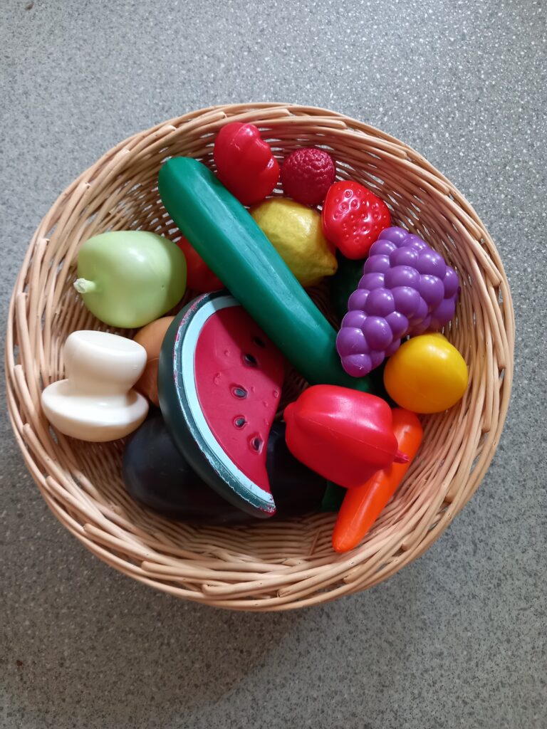 D’abord on observe et on nomme les fruits et légumes du coin cuisine .