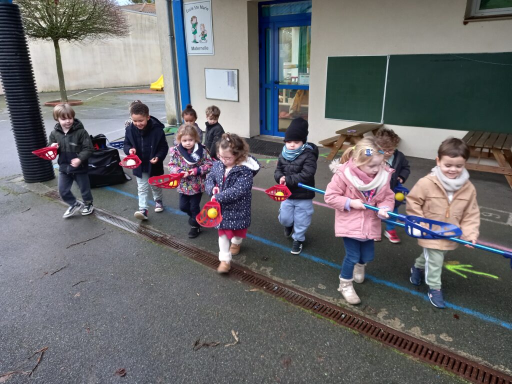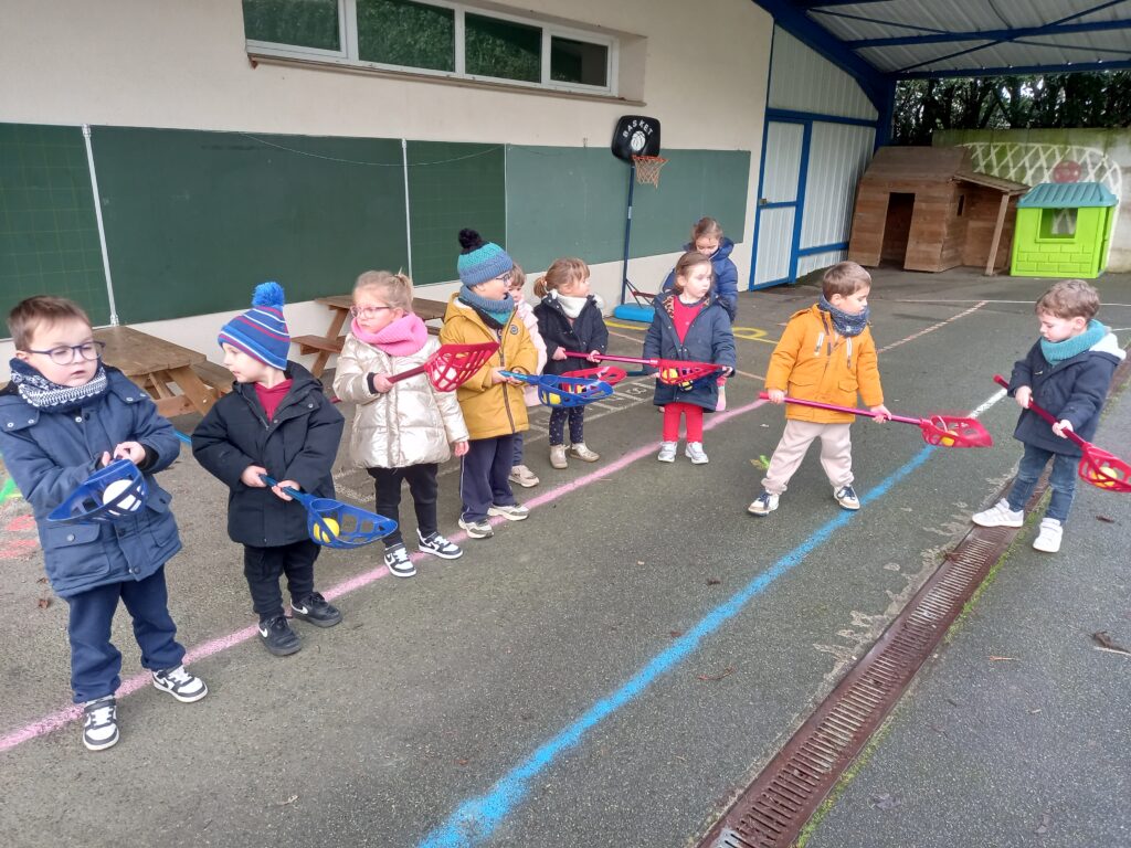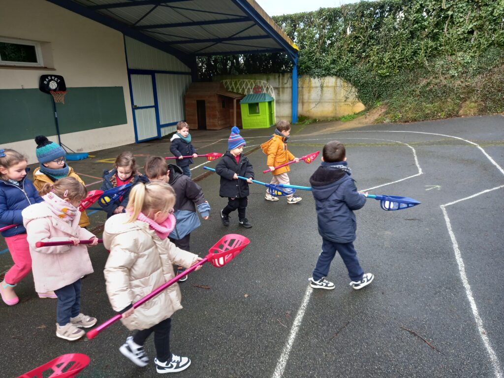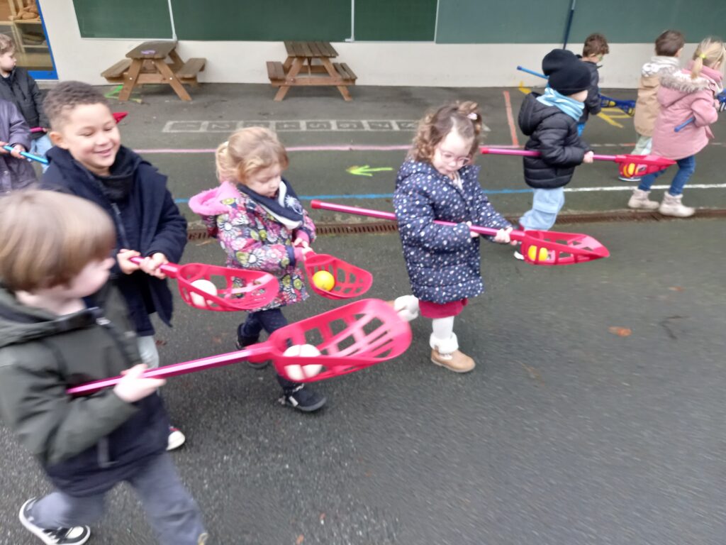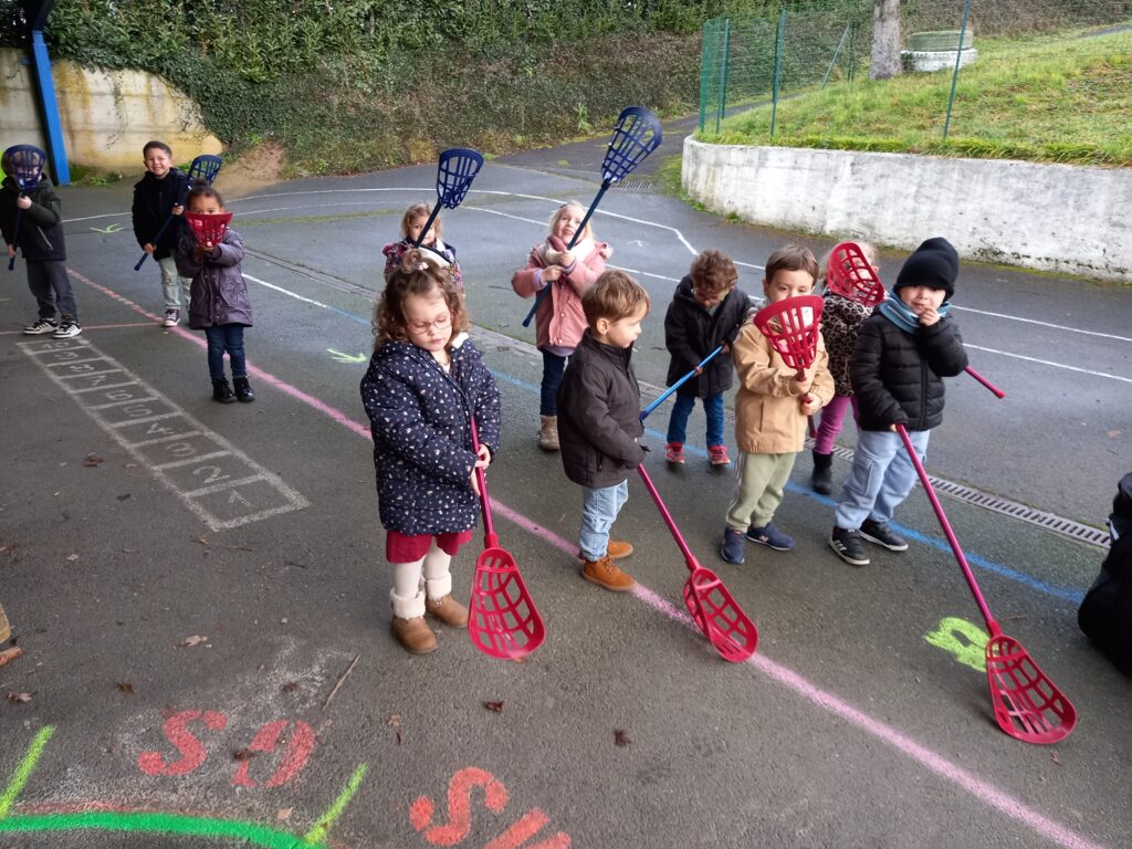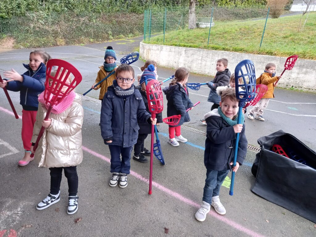Bien sûr avec les maternelles ce n’est pas la même façon de jouer , on découvre le matériel , on apprend à bien tenir la crosse, à ne pas faire tomber la balle et à se déplacer …